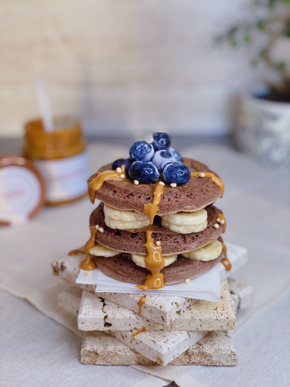 - Impila i pancakes, aggiungi la crema di yogurt e guarnisci con frutti di bosco freschi e menta.